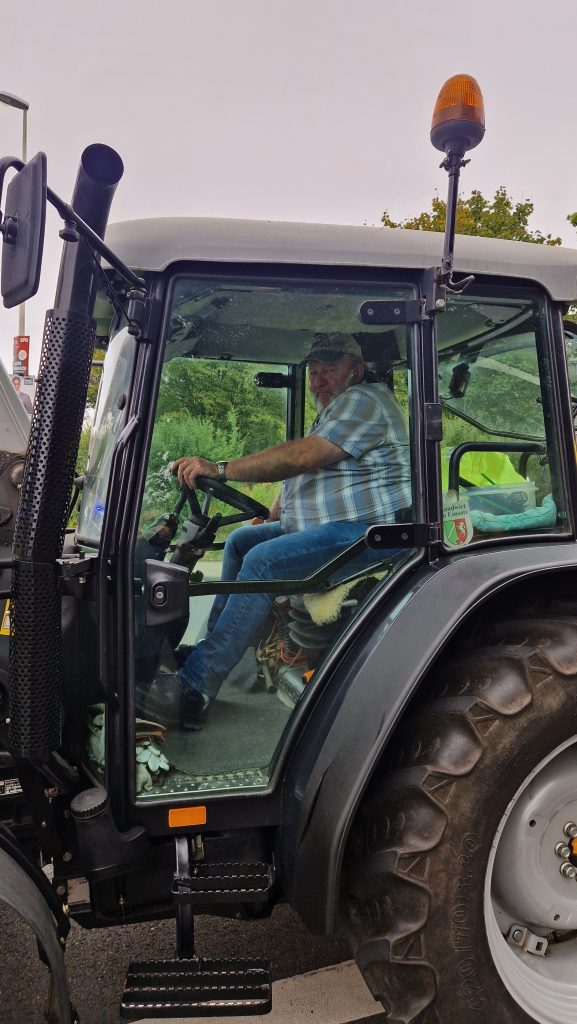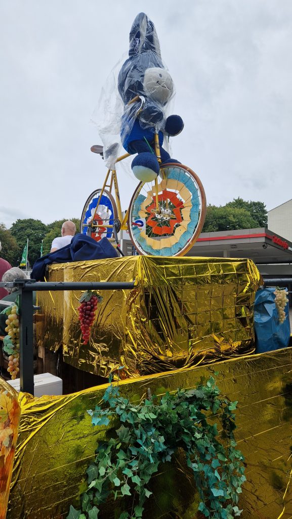 Der Festwagen war vorab vom eingespielten Team vorbereitet worden. Beim Umzug durfte unser Maskottchen Peter ganz oben mitfahren, durfte aber im Gegensatz zu seinen Mitfahrern weder Wein noch Traubensaft an die Zuschauer am Wegesrand ausschenken. Sicherheitshalber hatte er sich einen Regenumhang angezogen, denn die Wetterprognose hatte seit Tagen angekündigt, dass der Umzug zum ersten Mal seit Jahrzehnten bei Dauerregen stattfinden würde. So kam es dann aber zu großen Erleichterung aller glücklicherweise doch nicht.