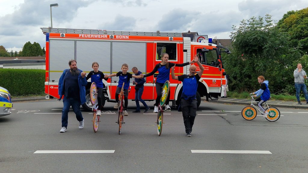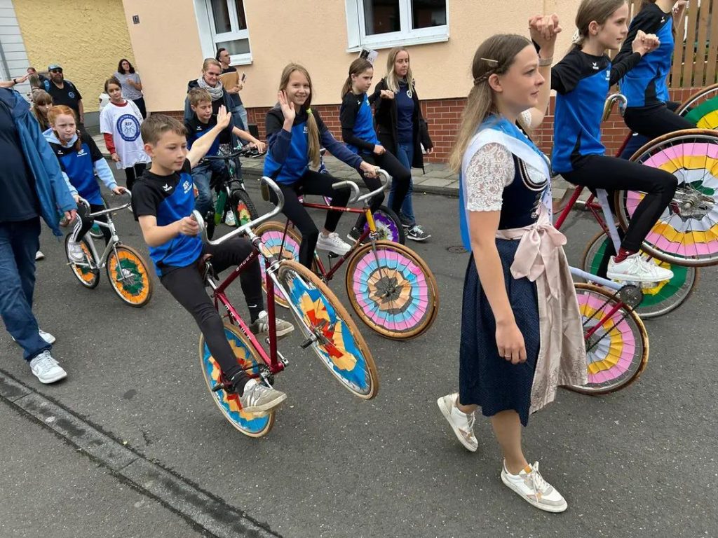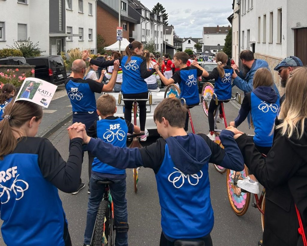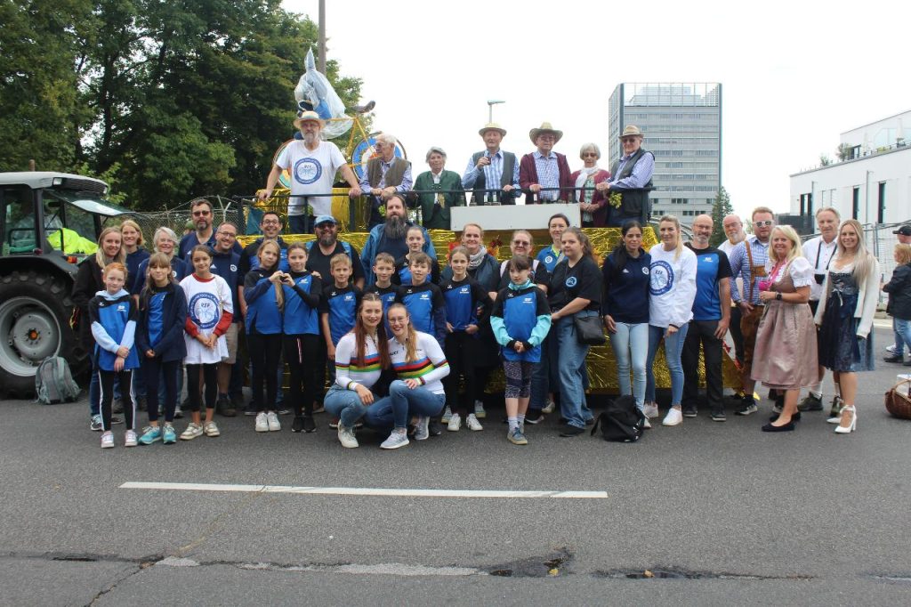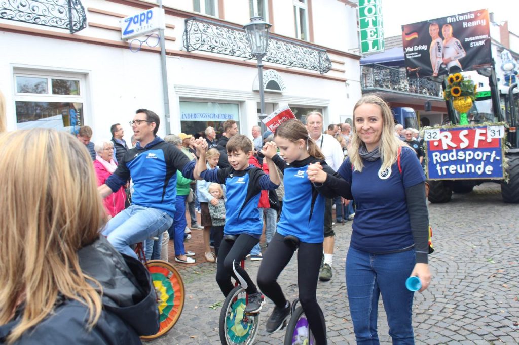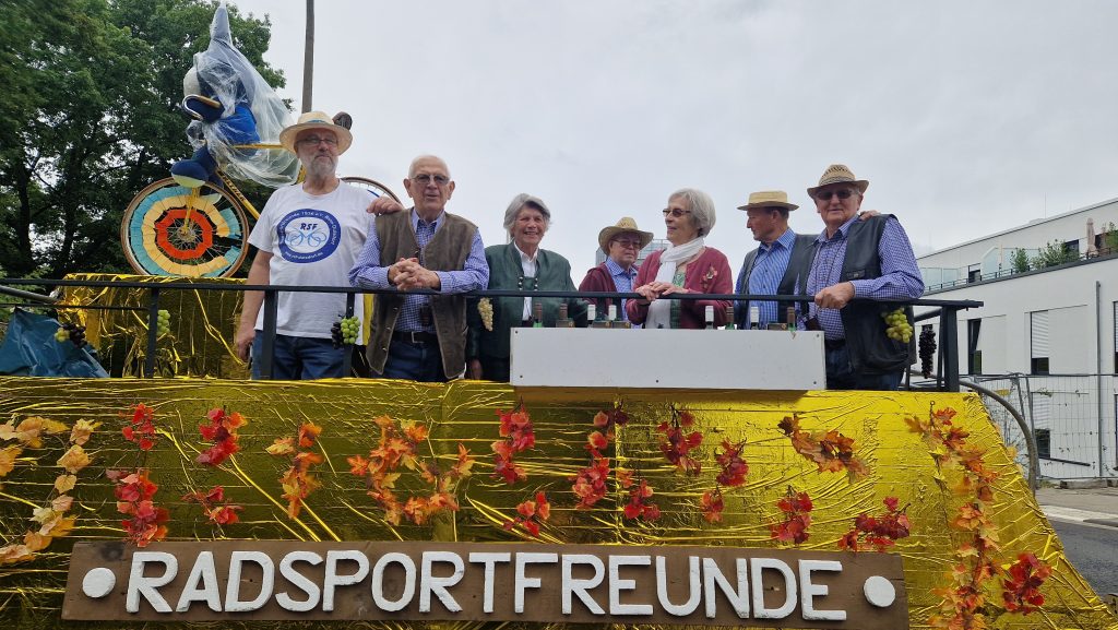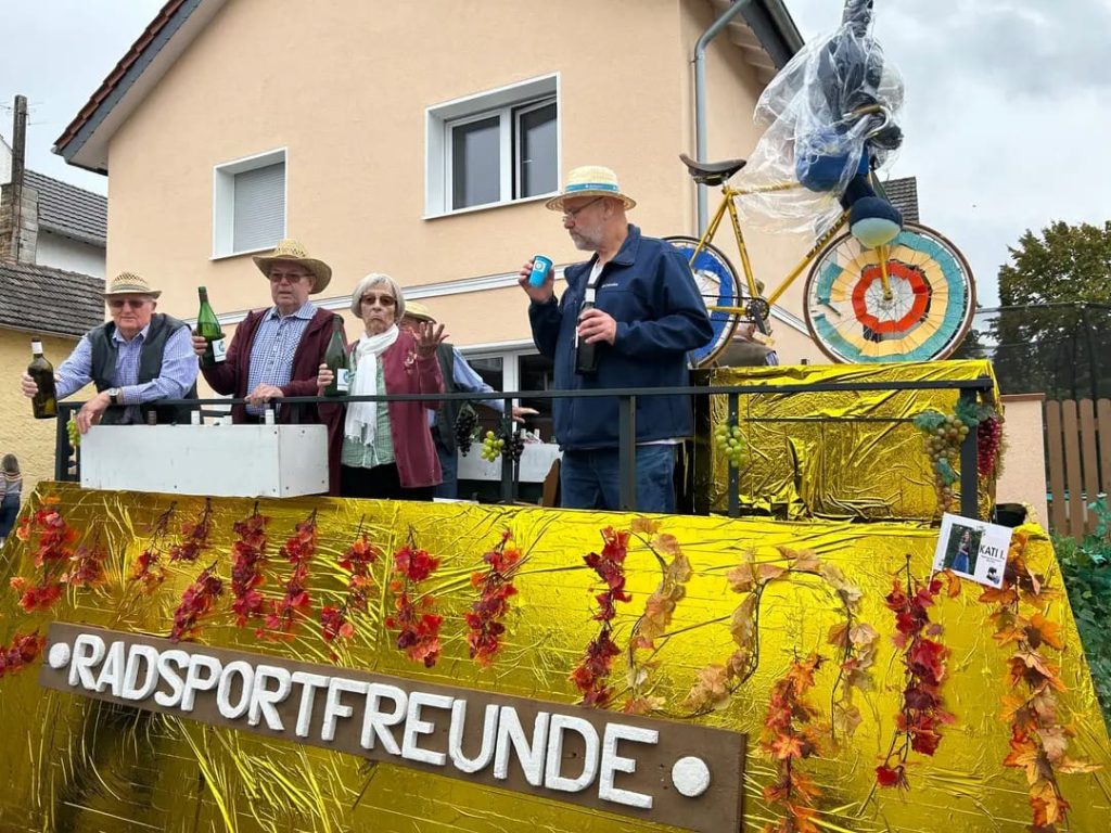 So konnten die Radsportfreunde erstmals mit drei Gruppen am Weinfestumzug teilnehmen. Vorweg Henny und Antonia im Cabrio, dann die sportlich aktiven Mitglieder mit Kunstradvorführungen auf ihren festlich geschmückten Rädern und schließlich der Festwagen.