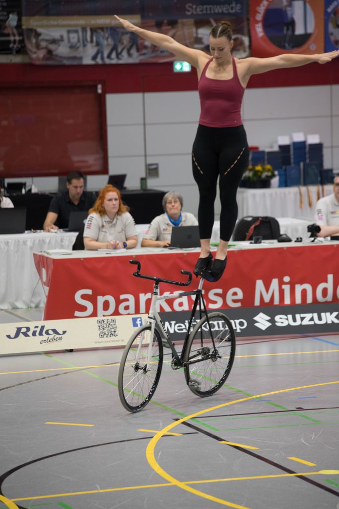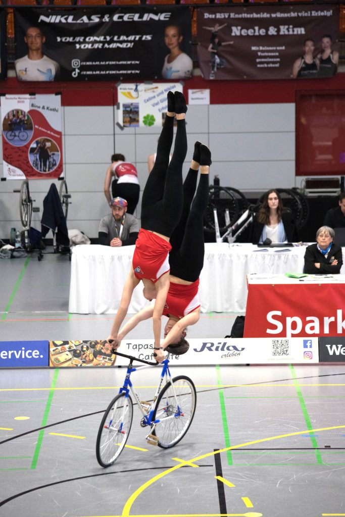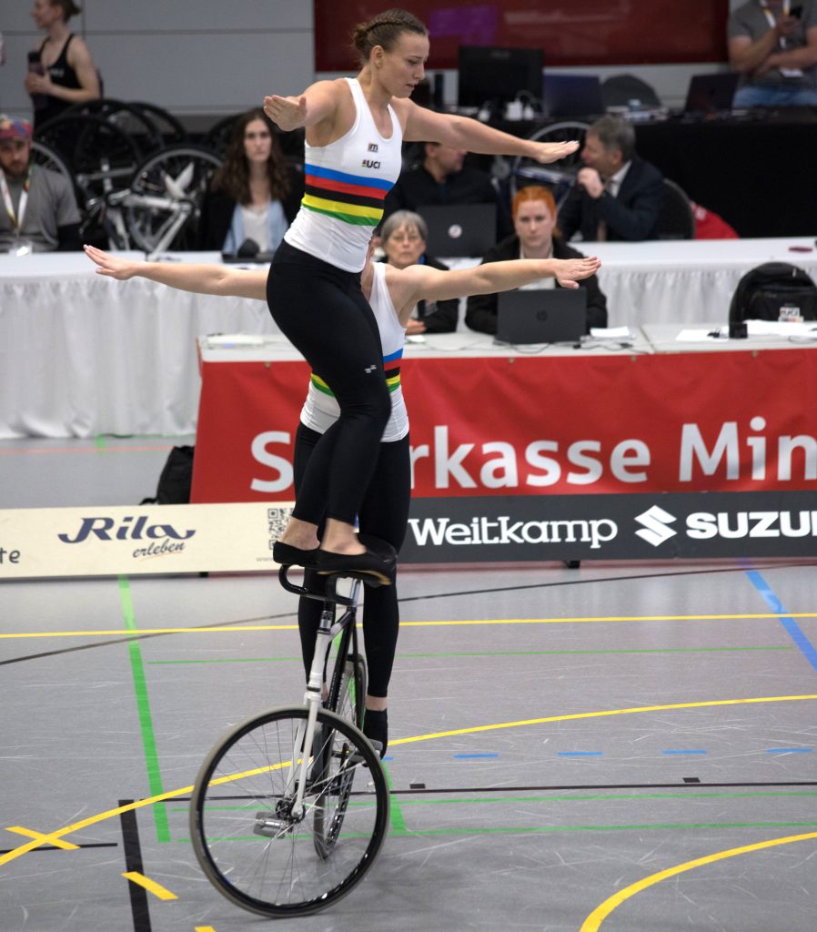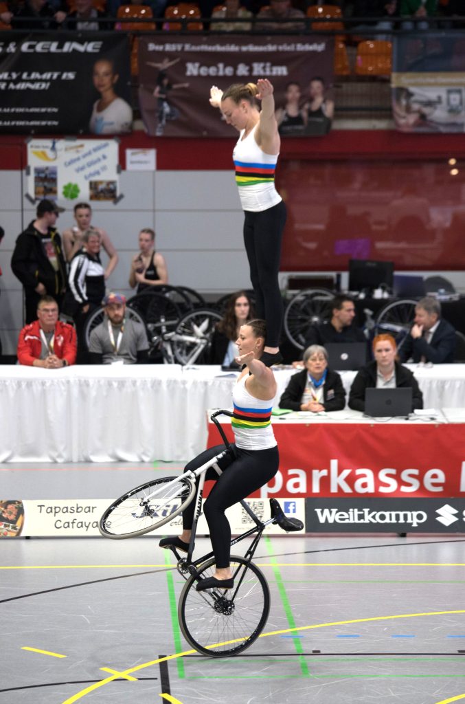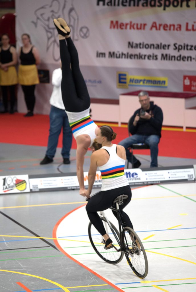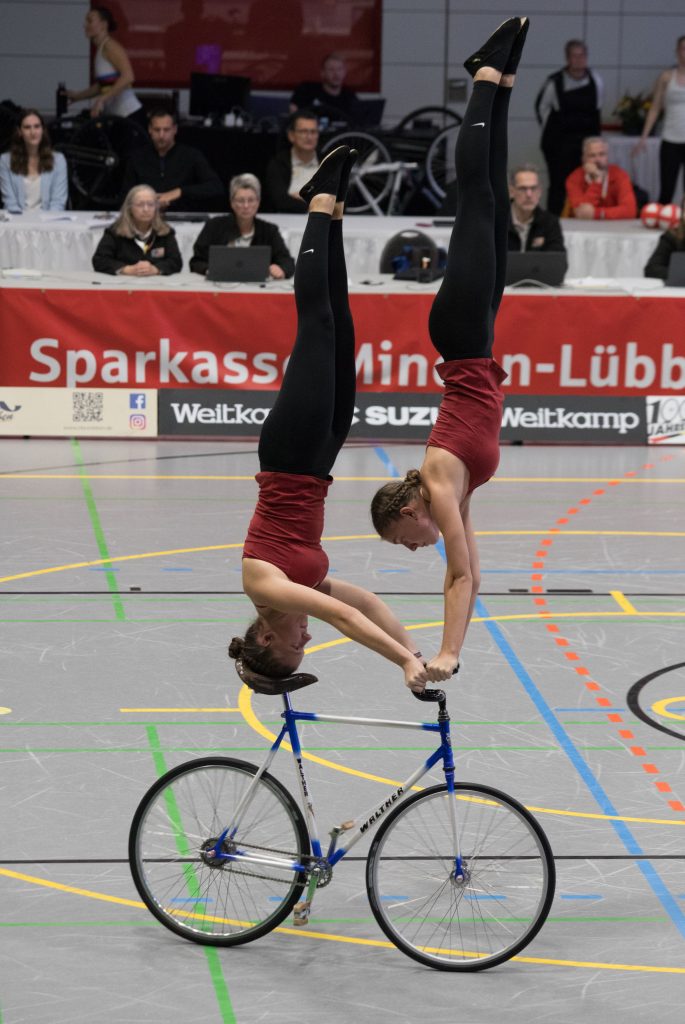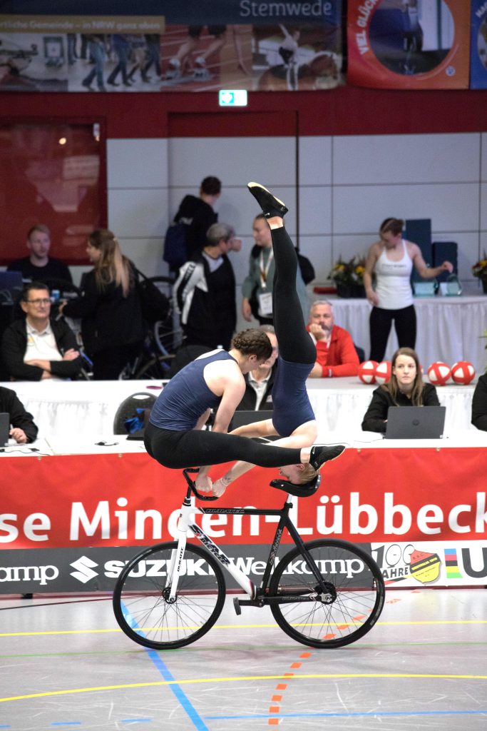 Im zweiten Teil der Kür auf einem Rad mit Handständen, Schulterständen und Hebeübungen fuhren sie dann gewohnt sauber, kamen schließlich auf 133,99 Punkte.