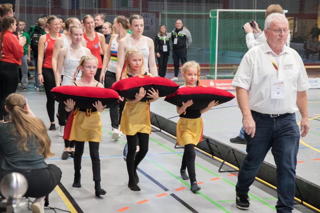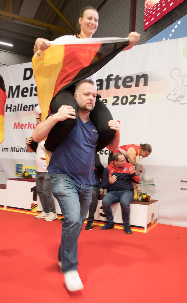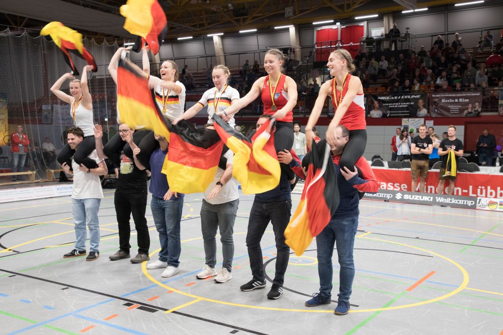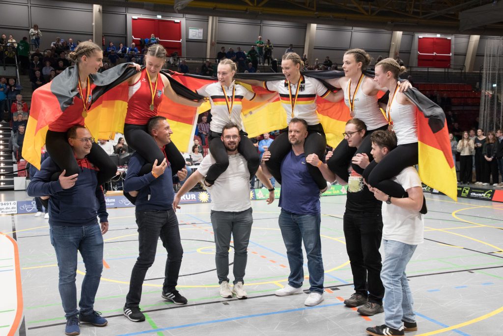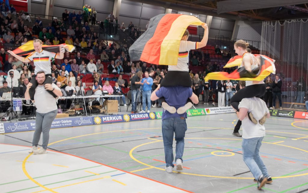 Getreu dem Motto „Niemand verlässt das Siegerpodest zu Fuß“ wurden die erfolgreichen Sportlerinnen auf Schultern durch die Halle getragen und vom Publikum bejubelt.