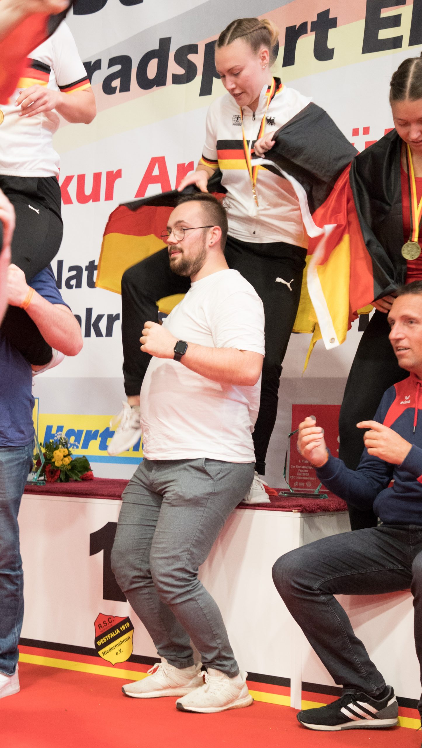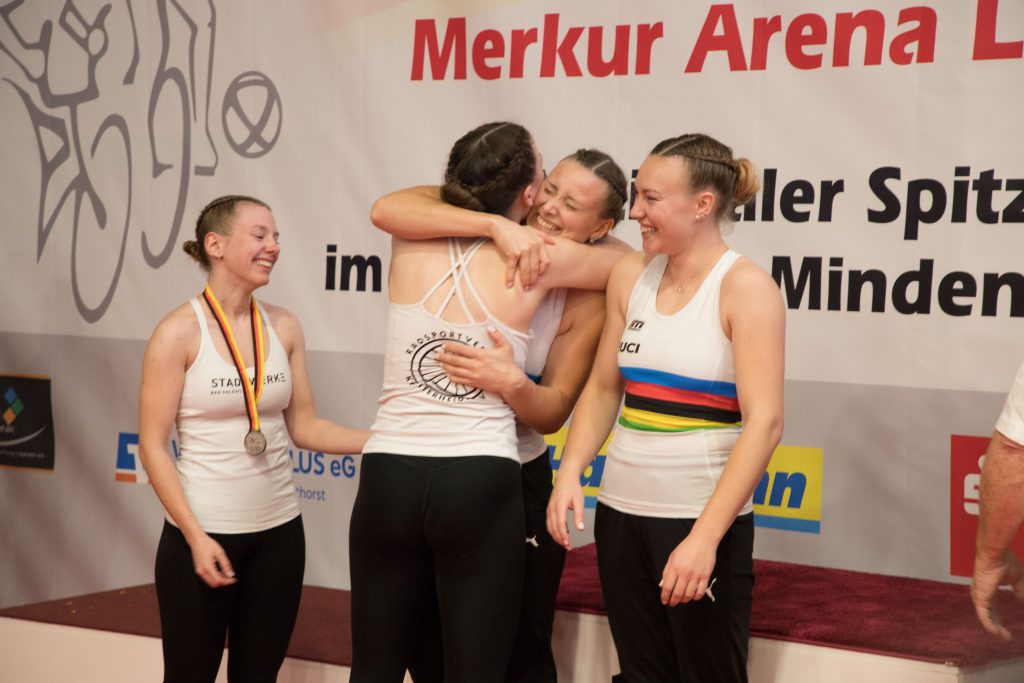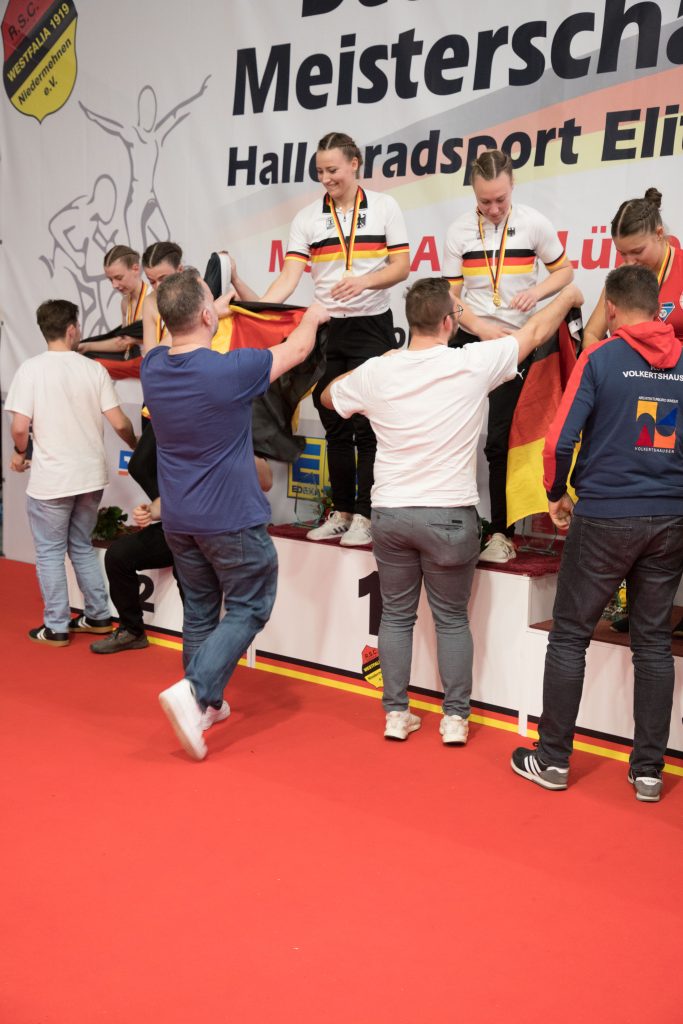 Allen wurden die Medaillen und Blumen überreicht. Für die alten und neuen deutschen Meisterinnen Henny und Antonia gab es zusätzlich die Meistertrikots und die Meistertrophäe.