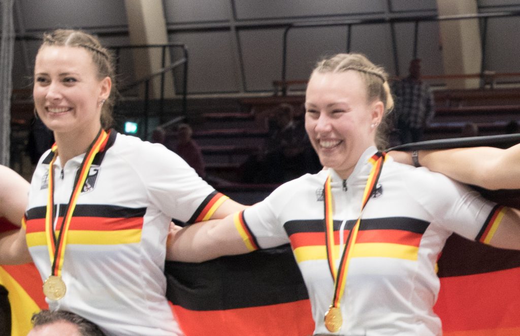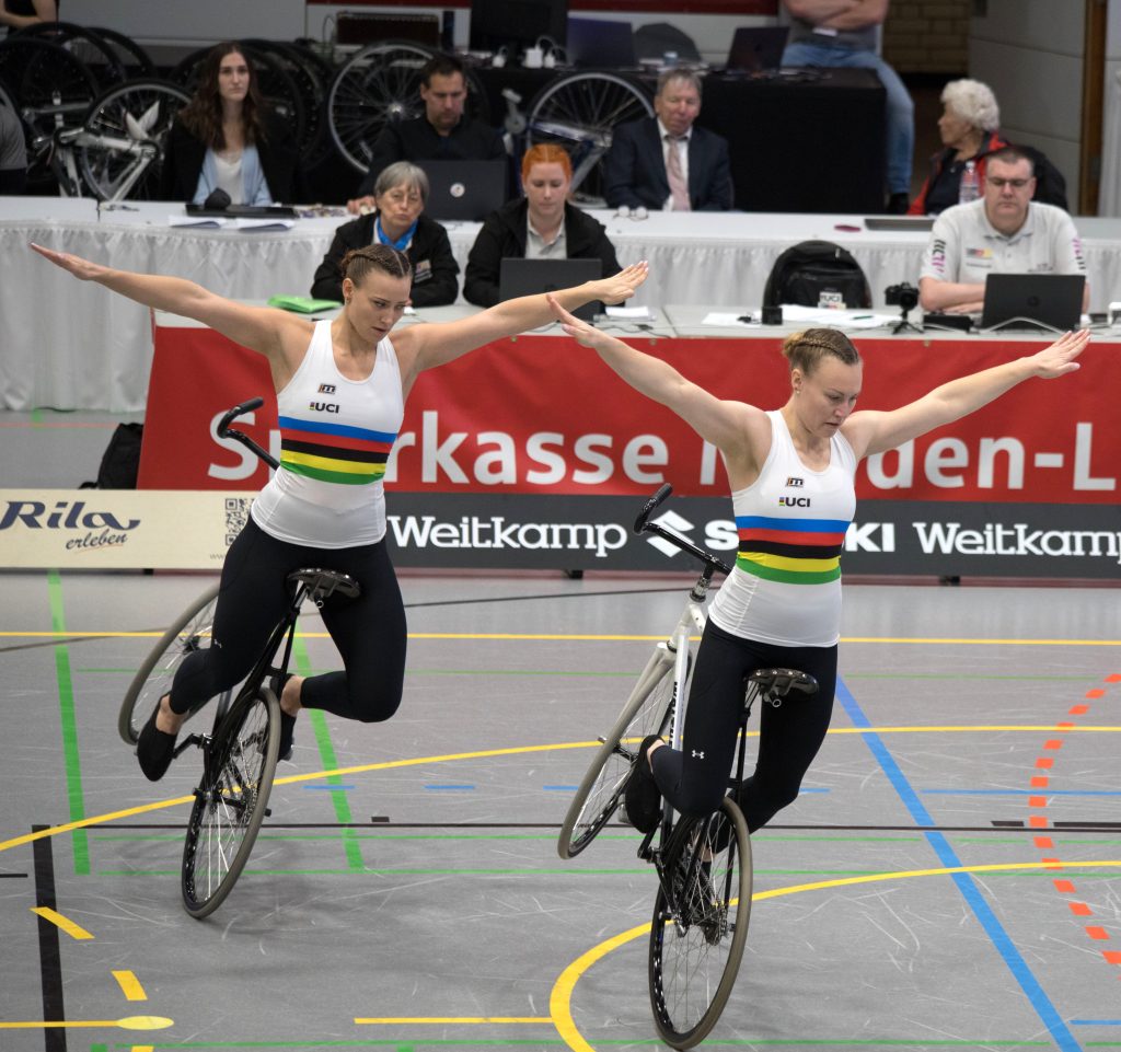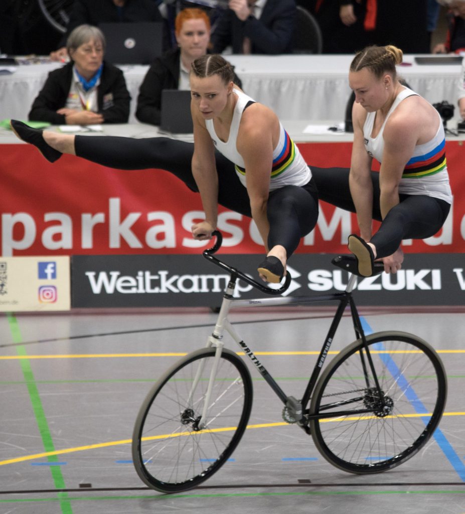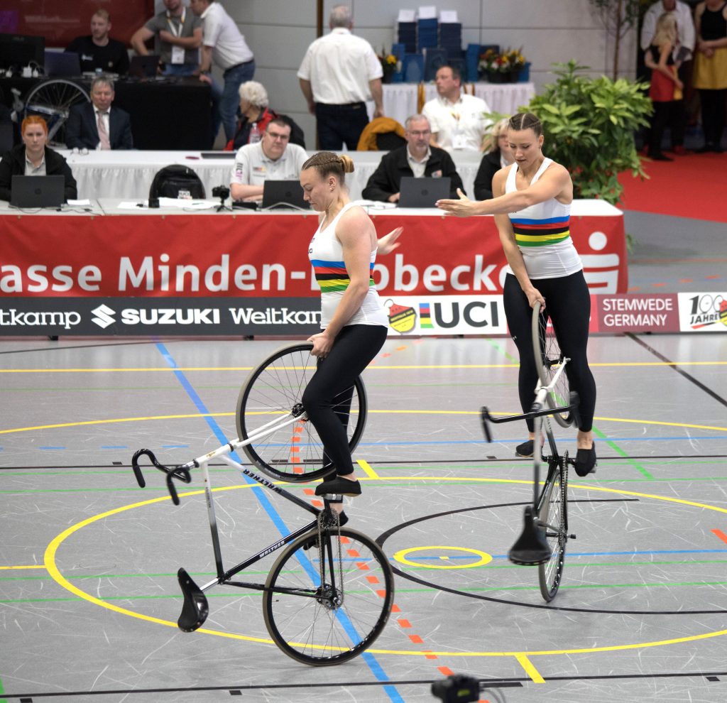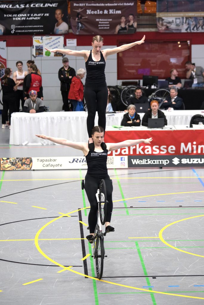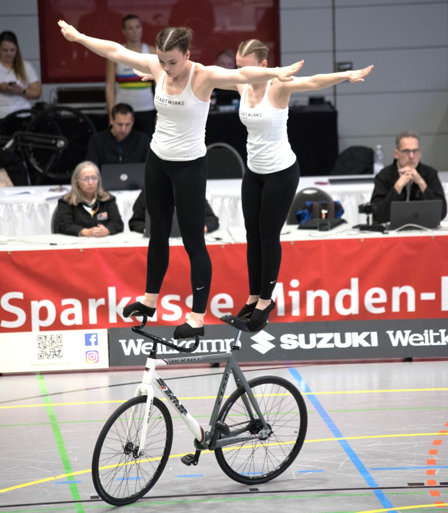 Henny Kirst und Antonia Bärk von RSF Bonn-Duisdorf waren bereits vorher für die WM qualifiziert. In Lübbecke ging es daher „nur“ noch um die Verteidigung des DM-Titels im Zweier-Kunstradfahren.