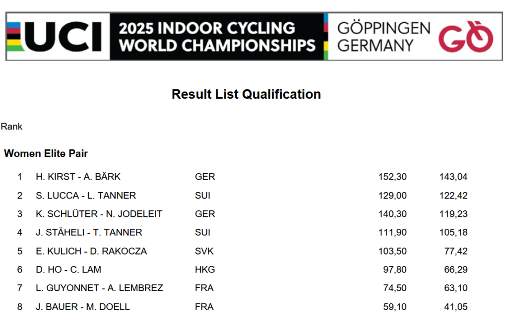 Für Kim und Neele verlief die Vorrunde am Samstag nicht wie erhofft, so dass sie sich mit dem dritten Platz hinter Simona Lucca und Larissa Tanner aus der Schweiz begnügen mussten. Henny und Antonia kamen mit nur geringen Abzügen auf 143,04 Punkte. Bereits am Donnerstagabend beim Wertungsfahren vor der eigentlichen WM hatten sie ein 143-er Ergebnis erzielt – beides zusammen stärkte ihr Selbstvertrauen für das Finale am Sonntagnachmittag. Der vierte Finalplatz ging an die Schweizerinnen Julia Stäheli und Tanisha Tanner. Die Teams aus Hongkong, der Slowakei und Frankreich verpassten das Finale mit großem Abstand und deutlich unter 100 Punkten.