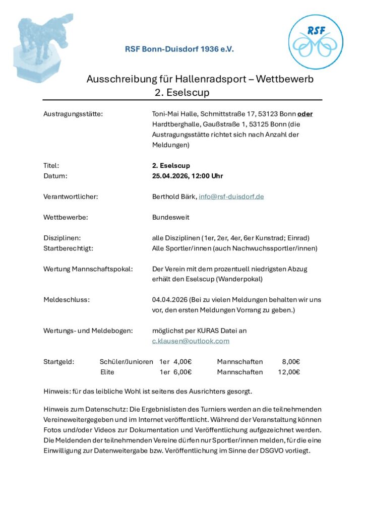 Noch friert des Duisdorfer Esel draußen im Schnee, doch bald darf er wieder in die Halle. Am 25. April findet in der Toni-Mai-Halle in Duisdorf der zweite Duisdorfer Eselscup statt. Die Ausschreibung ist ab jetzt verfügbar. Wir freuen uns sehr, wenn außer dem Esel auch viele Kunstradfahrer in die Halle kommen.